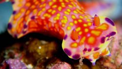 ニシキウミウシは、オレンジや紫、白などカラフルな体色がとても華やかなウミウシです。ゆっくりと海底を這う姿はまるで海中の舞踏会のようで、見つけると嬉しい気分になりますね。個体によって体色や模様が少しずつ