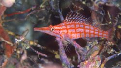 クダゴンベは、赤い格子模様がとても美しい魚です。細長い体ととがった口先が特徴的で、サンゴの隙間をヒラヒラと泳ぐ姿はとても可愛いですね。周囲に溶け込むようにしているので、見つけると嬉しい気持ちになります