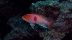 フタホシキツネベラは赤い体に2つの黒い斑点がとても可愛らしいベラの仲間ですね。斑点模様は小さいですが、背びれと尾びれの付け根にあるのでとても目立ちます。動きは活発で、岩の隙間やサンゴの間を忙しそうに泳
