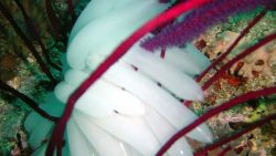 アオリイカの卵は透明なゼリー状のカプセルの中に入っていて、小さな真珠のような姿がとても可愛いですね。水中で揺れる卵の房は幻想的で、まるで海の宝石のように輝いています。孵化するまでの間、卵の中で小さなイ