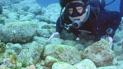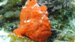 オオモンカエルアンコウは、体表の皮膚突起が細かく発達しており、苔やフジツボまで模倣できるほど高度に擬態するため、見つけた瞬間の驚きと興奮が格別です。見た目はまるで岩か海藻の塊で、肉眼では魚と認識できな