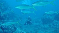 ボラの群れは、銀色に光る大きな魚たちがまとまって泳ぐ姿がとても迫力満点です。群れ全体で一斉に向きを変える瞬間はとても美しく、ダイビング中に見られると感動しますね。
