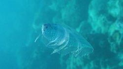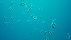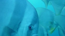 ツバメウオは、丸い体と長いヒレが特徴の優雅な魚です。群れでゆっくり泳ぐ姿はとても幻想的で、青い海に映えますね。