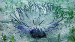 ムラサキハナギンチャクは、紫色の触手がとても美しいイソギンチャクです。ふわふわと揺れる姿はまるで花のようですね。
