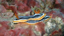 サラサウミウシは、白い体に赤い模様がとても華やかなウミウシです。のんびりと這う姿はとても癒されますね。