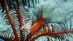 コマチガニは、ウミシダに隠れて暮らす小さなカニです。体の色や模様がウミシダそっくりで、見つけるととても嬉しくなりますね。