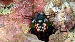 モンハナシャコは、カラフルな体色と大きな目が特徴の可愛いシャコです。巣穴から顔を出す姿はとても面白いですよ。