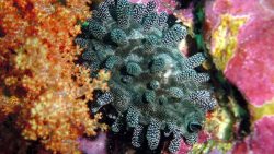 イバラカンザシは、カラフルな渦巻き模様がとても美しいゴカイの仲間です。青や黄色、オレンジなど色とりどりで、海中の花のように見えます。渦巻き部分は触手で、プランクトンを集めています。