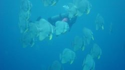 ツバメウオは、丸い体と長いヒレが特徴の優雅な魚です。群れでゆっくり泳ぐ姿はとても幻想的で、青い海に映えますね。