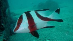 センネンダイは、赤い体に白い横帯が特徴のフエダイの仲間です。根周りをゆったりと泳ぐ姿はとても優雅で、見つけると嬉しい気持ちになりますね。