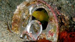 ミジンベニハゼは、小さな黄色い体に大きな瞳がとても可愛いハゼの仲間です。貝殻や空き瓶に住むことが多く、じっとこちらを見つめる姿は本当に癒されますね。ダイバーに人気の小さなアイドルです。