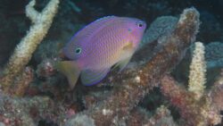 セナキルリスズメダイは、青い背中と黄色い体がとても可愛い小さな魚です。浅場でちょこまか泳ぐ姿はとても癒されますね。
