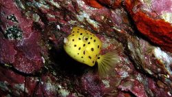 ミナミハコフグの幼魚は、黄色い体に黒い水玉模様がとても可愛い小さな魚です。ちょこまか泳ぐ姿は癒されますね。