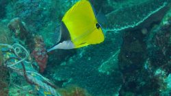 フエヤッコダイは、黄色い体に黒いラインが入った可愛い魚です。長い口先でサンゴの隙間をつつく姿はとても面白いですね。