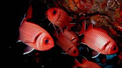 ウロコマツカサは、赤い体に銀色の鱗が光る美しい魚です。昼間は岩陰にひっそり隠れていて、夜になるとゆっくりと泳ぎ出します。光を当てると鱗がキラキラと反射してとても綺麗ですね。