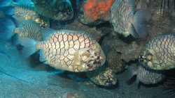 マツカサウオは、金色の鱗が松かさのように輝く美しい魚です。岩陰でじっとしている姿はとても神秘的ですよ。