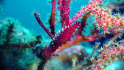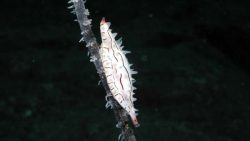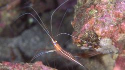 オキノスジエビは、透明感のある体に赤い縦線がとても綺麗な小型のエビです。光が当たると赤い線がキラキラと輝き、水中のアクセントになりますね。ダイビング中に見つけるとちょっと嬉しい発見です。