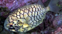 マツカサウオは、金色に輝く松ぼっくりのような模様が特徴の魚です。光が当たるとまるで水中の宝石のように美しいですね。ゆっくりと泳ぐ姿はとても可愛らしく、ダイビング中に見つけると嬉しくなる存在です。