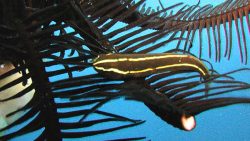 ウミシダウバウオは、ウミシダの中に住む可愛い魚で、細長い体に淡い色合いがとても特徴的ですね。動きは穏やかで、まるでウミシダの一部のようにひっそりと隠れて暮らしています。ウミシダに寄り添う姿はとても微笑