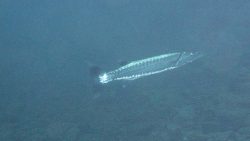 オニカマスは、鋭い歯と堂々とした姿がとても迫力ある大型魚です。銀色の体が光を反射し、ゆっくりと泳ぐ姿はまるで海の王者のようですね。群れで行動することもあり、見つけるとちょっとドキドキする存在です。