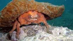 イソカイカムリは、貝殻や海綿を背負って擬態する可愛いカニです。隠れる姿はとても面白いですね。