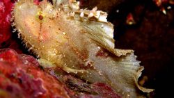 ハダカハオコゼは、体が平らで葉っぱのように見えるユニークな魚ですね。体色は周囲の環境に合わせて変わることがあり、ピンクや白、黄色など多彩です。じっとしていることが多く、海藻やサンゴに溶け込む擬態の達人