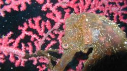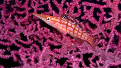 ニシキフウライウオは、細長い体とレースのような模様がとても美しい魚です。サンゴやウミシダにそっくりな擬態で、見つけるととても嬉しいですね。