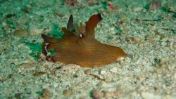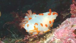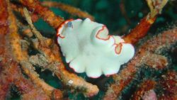 アワシマオトメウミウシは、白い体にオレンジ色の縁取りがとても可愛い小さなウミウシです。ゆっくりと這う姿はとても優雅で、ダイビング中に見つけると嬉しい気持ちになります。