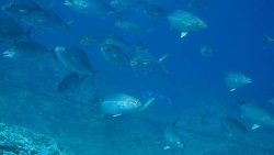 カンパチの群れは、大きな体と黄色い縦線がかっこいい回遊魚です。群れで泳ぐ姿はとても迫力があって見応えがありますね。