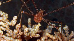 オルトマンワラエビは、長い脚と細長い体がとてもユニークな小さなエビです。岩陰でひっそり暮らす姿はとても面白いですよ。