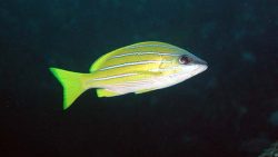 ヨスジフエダイは、黄色い体に黒い縦線がとても美しい魚です。群れで泳ぐ姿はとても華やかですよ。