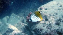 B-POINT前 トゲチョウチョウウオ トゲチョウチョウウオは、白い体に黒い縦縞が特徴的な美しいチョウチョウウオです。目の後ろに黒い帯があり、尾の付け根には目玉模様があるのも特徴ですね。ペアで仲良く泳ぐことが多く、ダイバーにも人気の魚です。 初級B-POINT前