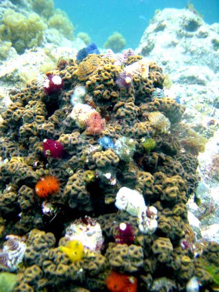 イバラカンザシは、クリスマスツリーのように美しい形状の触手を広げるケヤリムシの仲間です。鮮やかな赤や青、黄色などカラフルな色彩が特徴的で、潮の流れに合わせて触手を広げたり縮めたりする姿はとてもかわいらしいですね。動かない生き物なので、じっくり観察できるのも魅力です。