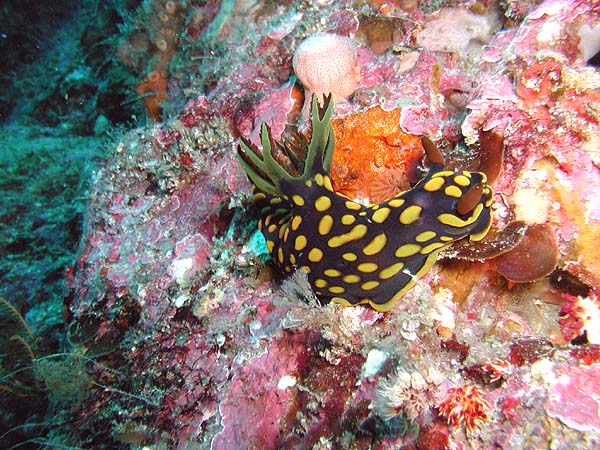 ゆったりと水底を這うように移動し、カラフルな体色で海中を彩ります。時に他のウミウシと同じ場所に集まることもあります。