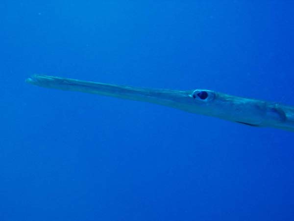 アオヤガラは長い口先と細長い体が特徴の魚ですね。水中でゆっくりとホバリングするように泳ぐ姿はとても優雅です。青みがかった体色が光を反射するとキラキラと美しく、まるで水中の飛行船のようです。小魚の群れと一緒に泳ぐ姿もよく見られ、写真映えする人気者ですね。
