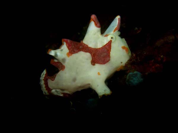 クマドリイザリウオは、白地に黒や赤の模様がとても可愛らしい魚です。イザリウオの仲間で、胸びれを手のように使い、海底を這うように移動する姿がユニークですね。とても擬態上手で、周囲の色や模様に紛れて隠れるのが得意です。ゆっくり動くのでじっくり観察でき、見つけた時の喜びはひとしおです。