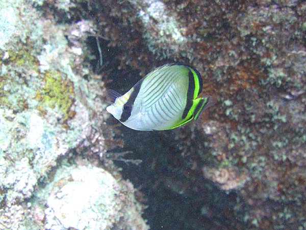 フウライチョウチョウウオは、黄色い体に黒い縦帯が美しく、尾の付け根には特徴的な斑点があります。敵を惑わせる役割があるとも言われているその斑点模様は、見れば見るほど面白いですね。サンゴ礁の浅場でペアや小さな群れを作り、仲良く泳ぐ姿はとても微笑ましく、初心者ダイバーでも観察しやすいです。