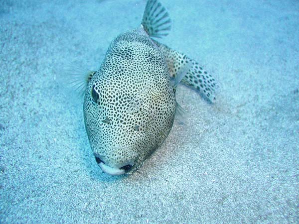 モヨウフグは、ずんぐりした丸い体と独特な模様が特徴のフグの仲間です。警戒心があまり強くなく、ゆっくり泳ぐ姿はとても愛嬌がありますね。ぷっくりした体がとても可愛く、ダイビング中に出会うと癒されます。