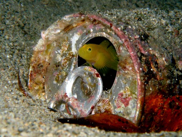 ミジンベニハゼは、小さな黄色い体に大きな瞳がとても可愛いハゼの仲間です。貝殻や空き瓶に住むことが多く、じっとこちらを見つめる姿は本当に癒されますね。ダイバーに人気の小さなアイドルです。