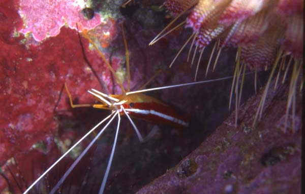 赤白縞模様は地域によって入り方に個体差があり、模様の位置で個体識別も可能です。「クリーナーシュリンプ」として魚との共生関係も研究対象になっています。垂直環境でエビの向きが変わると色味が違って見えることもあります。