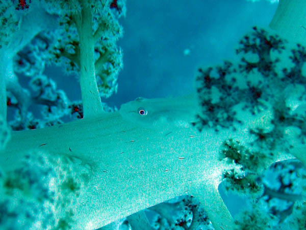 スケロクウミタケハゼは、ウミタケサンゴの上でじっと佇む可愛い小さなハゼです。半透明の体と大きな瞳がとても愛らしく、サンゴの上でひっそりと過ごす姿はまるで水中の小さな守り神のようです。