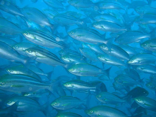 イサキの群れは、銀色に輝く体が水中を舞う姿がとても美しいです。群れで一斉に動く瞬間は迫力満点で、ダイビング中の見どころの一つですね。光の当たり方でキラキラ輝く姿は本当に感動的です。