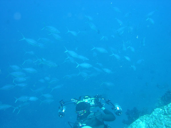 ツムブリは、青緑の体が太陽光でキラキラ輝くとても綺麗な回遊魚です。群れで素早く泳ぐ姿は迫力満点で、ダイビング中に見られるととても感動しますね。