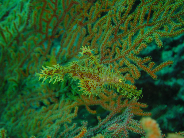 ニシキフウライウオは、細長い体とレースのような模様がとても美しい魚です。サンゴやウミシダにそっくりな擬態で、見つけるととても嬉しいですね。