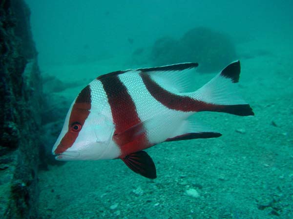 センネンダイ 平崎 2025.05.25 [ 平崎 ][ 中級 ] 体長 30〜50cm程度 水深 10〜40m程度 生息環境 サンゴ礁や岩礁の根周り 分類 スズキ目・フエダイ科 センネンダイは、赤い体に白い横帯が特徴のフエダイの仲間です。根周りをゆったりと泳ぐ姿はとても優雅で、見つけると嬉しい気持ちになりますね。 食べ物 小魚や甲殻類を食べます。 日頃の生活 昼間は根周りをパトロールするように泳いでいます。 まめ知恵袋 赤い体に白い帯はとても目立って綺麗ですよ。 撮影する時のコツ ワイド撮影で赤い体を引き立てるととても迫力のある写真になります。 [ 平崎 ][ 中級 ]