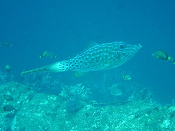 ソウシハギは、体に不思議な模様が広がる大きな魚です。おっとりした動きと鮮やかな模様は見ているだけで楽しいですね。ときどき中層を優雅に泳いでいる姿はとても美しいです。