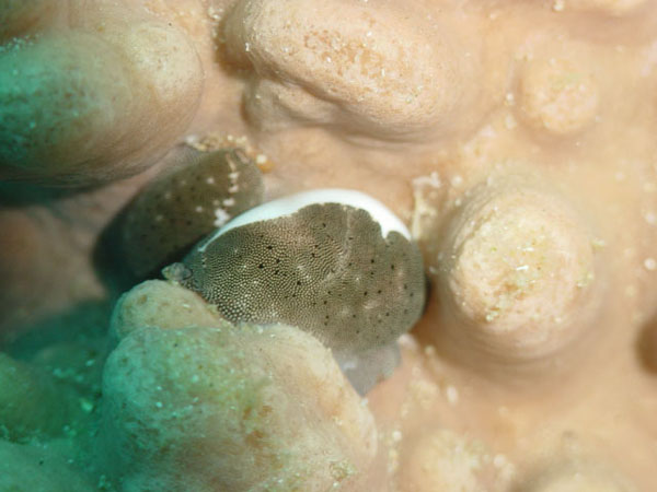 殻を隠すように外套膜を広げてじっとしています。