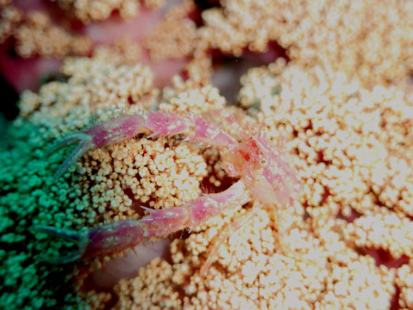 ヒヅメコシオリエビの仲間は、赤や白の模様が可愛い小さなエビです。長い脚を器用に動かしながらひっそり暮らす姿はとても癒されますね。