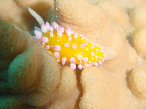 イガグリウミウシ 小島 2025.05.25 [ 小島 ][ 中級 ] 体長 3〜5cm程度 水深 5〜20m程度 生息環境 サンゴ礁や岩礁の壁面や根周り 分類 裸鰓類・フジタウミウシ科 イガグリウミウシは、白い体にオレンジや黄色の突起が可愛いウミウシです。小さな体でのんびり移動する姿は癒されますね。 食べ物 付着藻類や微小な生物を食べます。 日頃の生活 壁面や根周りをのんびり移動しています。 まめ知恵袋 突起の色合いはとても可愛いですよ。 撮影する時のコツ マクロ撮影で突起をしっかり写すととても可愛い写真になります。 [ 小島 ][ 中級 ]