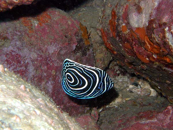 タテジマキンチャクダイの幼魚は、青い体に白い渦巻き模様がとても美しい魚です。成長するにつれて模様が変わっていく姿はとても面白いですよ。